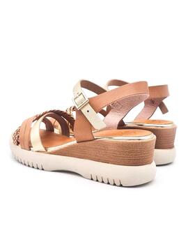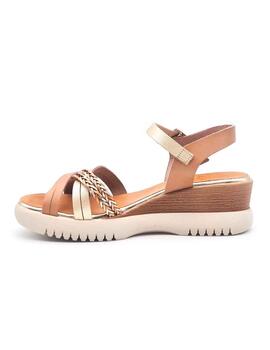 Sandalia para mujer, de la marca Porronet en color taupe y dorado en contraste. Fabricada artesanalmente en España. Cuenta con una original pala de tiras entrelazadas, con diferentes diseños trenzados y lisos, y pulsera tobillera con cierre mediante hebilla metálica ajustable que proporciona una sujección óptima de tu pie al caminar. Plantilla acolchada de piel, que garantiza una gran comodidad incluso durante largos períodos de uso. Suela de goma antideslizante, con cuña de apróx. 5 cm altura y plataforma de apróx. 2 cm, que ofrecen un poco de altura sin sacrificar la estabilidad. Este modelo es una opción elegante y versátil para complementar tus looks de verano.